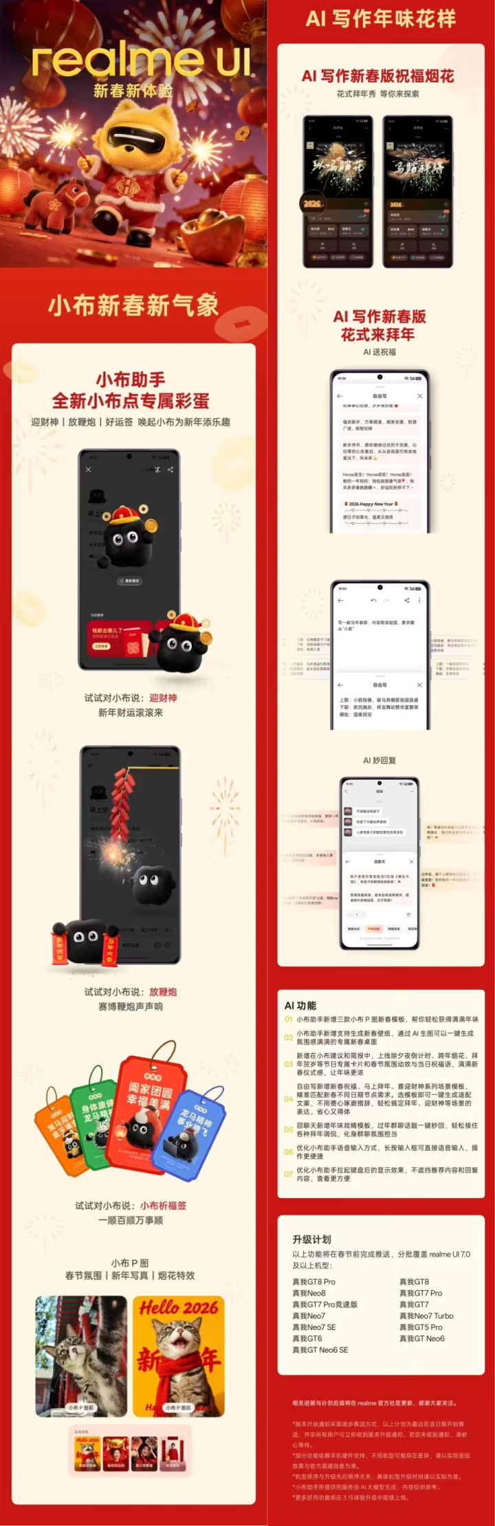 每年新春佳节各大智能手机品牌都会为旗下机型推出全新的喜气洋洋的个性化旗舰签名以及壁纸等,当然今年也不例外。日前, @真我手机 也推出了realme UI的新春新体验。其中包含小布助手专属彩蛋、AI新春祝福等,在强化用户节日使用感的同时,还覆盖了包括真我 GT8 Pro、Neo7 Turbo、GT Neo6、真我GT5 Pro等多款机型,并表示春节前将完成推送。