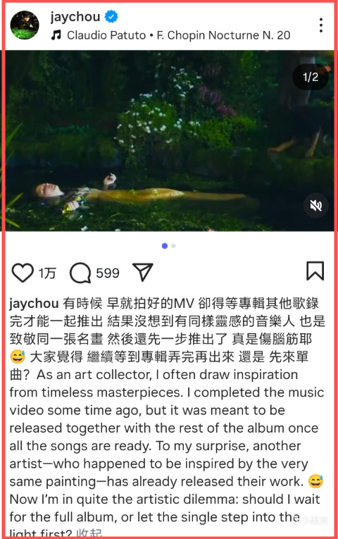 他提到早就拍好的 MV,得等专辑其他歌曲录完才能一起推出,可没成想,有位和他有同样灵感的音乐人,同样是致敬名画《Ophelia》,却先一步推出了作品,这让他纠结不已,还向大家询问是该继续等专辑弄完再发布,还是先以单曲形式推出。