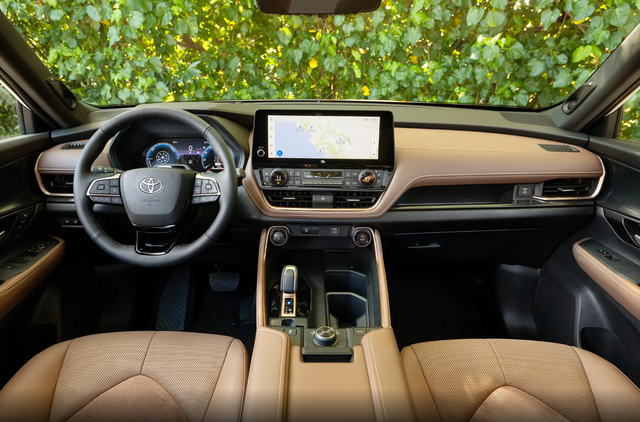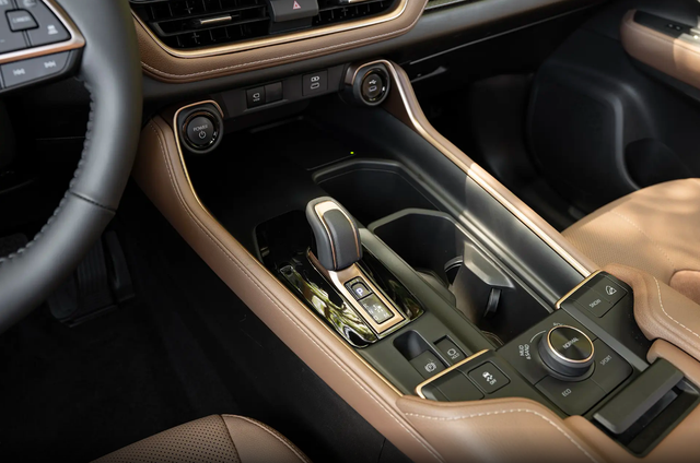 丰田Grand Highlander在内饰方面,有着不错的氛围感和质感,新款车型内饰由黑色和棕色组成,一些细节还增加了金色装饰件,提升了内饰的精致感,换挡机构采用电子式,中控屏幕的尺寸为12.3英寸,新款车型还提供JBL音响,360全景影像,座椅加热,通风,倒车雷达等配置。