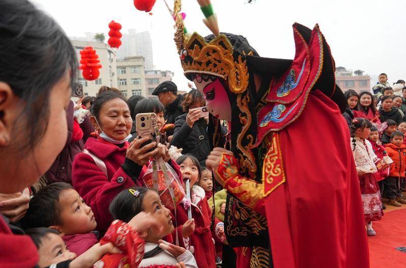 2025年12月31日,贵州省毕节市纳雍县广黔同心幼儿园“童趣庙会”现场,家长和小朋友一起观看川剧变脸表演。杨英摄