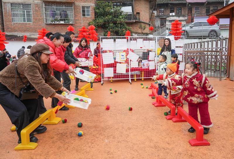 2025年12月31日,贵州省毕节市纳雍县广黔同心幼儿园“童趣庙会”现场,家长和小朋友一起玩亲子接福游戏。杨英摄