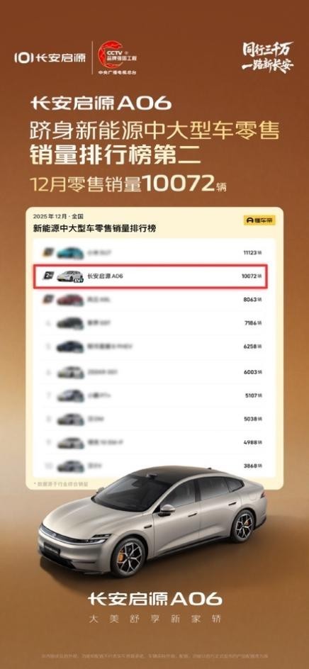 12月刚过,新能源车销量榜单又悄悄刷新了一遍。在一堆熟悉的面孔里,有个名字格外显眼——长安启源A06,单月销量突破10072辆,直接冲上新能源中大型车零售榜第二。