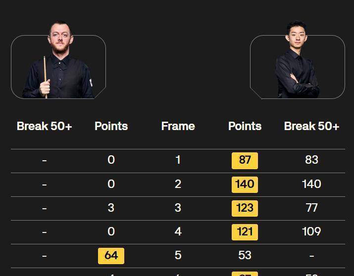 第二局他更是轰出了单杆140分的高分,再次零封艾伦。 此时艾伦的手感已经冰凉,第三局他尝试进攻中袋失误,留给吴宜泽一个袋口球,后者再次上手打出77分。 第四局吴宜泽在获得机会后,毫不犹豫地打出了本场第二杆破百——109分,带着4比0的绝对优势进入中场休息。