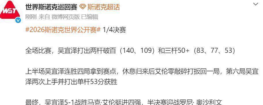 中场休息回来,艾伦在第五局以64比53艰难扳回一城,避免了被零封的尴尬。 但这也仅仅是延缓了失败的到来。 第六局,吴宜泽虽然出现了母球摔袋的失误,但最终还是以97比4锁定胜局,总比分5比1强势晋级四强。 全场比赛,吴宜泽打出了两杆破百和三杆50 ,进攻成功率高达惊人的程度。