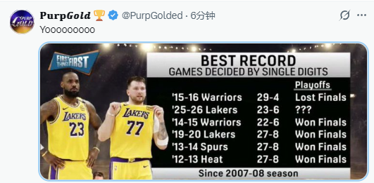 北京时间3月21日,湖人媒体PurpGold发文,晒出了一项关于湖人队的数据。根据数据统计显示,本赛季湖人队分差在个位数的比赛中,总计取得了23胜6负的战绩,自2007-08赛季以来,胜率仅次于15-16赛季的勇士队,排名第二。